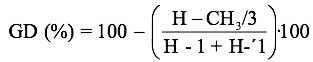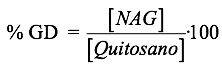 donde GD es el grado de desacetilación, H–CH3 el valor del área bajo la curva de la señal del protón metílico, H–1 el área de la curva del protón con desplazamiento alrededor de 5,2 ppm, y H–’1 el área de la curva del protón con desplazamiento alrededor de 5,4 ppm.
