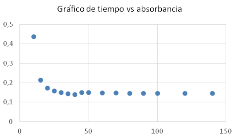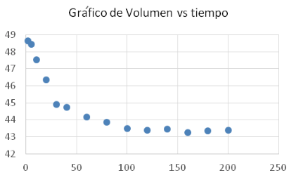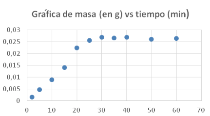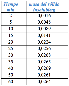 En el proceso de desmineralización con el HCl, se debe tener en cuenta la liberación de dióxido de carbono a partir de la reacción ácida del carbonato de calcio o magnesio contenido en las cabezas de langostino. Para obtener los parámetros óptimos de este proceso, se tuvo que extraer una alícuota periódicamente y analizar el porcentaje de sólidos, la variación del pH y así hacer una curva y encontrar el parámetro óptimo. Por ejemplo, cuando se trabaja con HCl al 6% v/v, para obtener el tiempo optimo se tomó alícuotas de 20 mL de solución de la mezcla reaccional periódicamente se filtró con papel de filtro rápido y se eliminó el agua colocándole en una estufa a 40 °C, durante 2 días, esto se realizó por triplicado, luego se determinó el peso en promedio y observando la gráfica (ver Figura 1 y Tabla 2) se determinó el tiempo óptimo que es de 30 minutos [8].