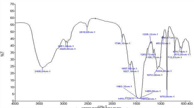 Para el caso de la determinación del porcentaje de DA hay tres métodos: En el caso de la espectroscopia IR, las muestras se molieron y tamizaron hasta tener un tamaño de malla 100, luego, se añadió KBr en una relación de 2:98 p/p, la mezcla fue prensada hasta obtener una pastilla muy delgada y traslúcida, que fue usada para obtener el espectro de la quitina, analizando sus bandas se identifican las bandas características: banda del O–H a 3.434, N–H alrededor de 3.200, C–H a 2.920 banda de la amida I a 1.657 y 1.627 cm–1 , banda N–H a 1.434, C–O–C a 1.072 y a 848 cm–1 bandas de la tensión de los grupos anoméricos (ver Figura 3a). Luego, aplicamos las fórmulas para calcular el grado de desacetilación, así tenemos para 52,85% para la quitina. Para los otros biopolímeros se realizan los otros dos métodos [12].