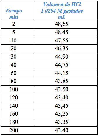 En el proceso de desacetilación para obtener el quitosano también se trabajó de la misma manera que los dos procesos anteriores, se tomó periódicamente alícuotas de 25 mL de solución de NaOH de la mezcla reaccionante (previamente filtrada), luego esta alícuota se diluye a 500 mL, luego se toma una alícuota de 50 mL, el cual se tituló con HCl 0,25 M, previamente valorado. Después estos valores (ver Tabla 3), tiempo de reacción y volumen de HCl gastado, se grafican, tal como se observa en la Figura 2 y Tabla 3.