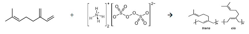 El mirceno se polimerizó a través de un mecanismo de radicales libres en medios acuosos para proporcionar un poli(β–mirceno) de bajo peso molecular (Mn < 10,000 g·mol−1) a medio peso molecular (Mn hasta 90.000 g·mol–1), registrándose un total de 21 pesos moleculares. Sin embargo, los polímeros sintetizados a menudo contenían una fracción de gel insoluble y una microestructura no controlada, con solo aproximadamente el 50% de las unidades 1,4–(cis y trans) en la cadena del polímero [23,29].