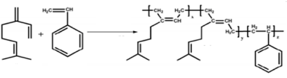 Zhao y Schlaad [13], estudiaron la síntesis mediante polimerización y copolimerización por emulsión de mirceno para la producción de cauchos sintéticos. También mediante polimerización en emulsión, se han logrado obtener elastómeros basados en β–mirceno y estireno (St), los cuales presentan un comportamiento de fluido pseudoplástico, garantizando buenos resultados con el aumento de la temperatura de degradación (Td), y una temperatura de transición vítrea (Tg) por debajo de los 0°C [14].