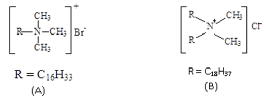 Para tornar a argila compatível com a matriz de PEAD e assim poder ser utilizada em compósitos, os íons sódio presentes entre as lamelas da argila foram trocados por íons de sal de amônio quaternário (brometo de cetiltrimetilamônio e cloreto de alquildimetilbenzilamônio), para produzir a argila organofílica. As estruturas químicas dos sais de amônio que foram utilizados neste estudo são apresentadas na Figura 1.