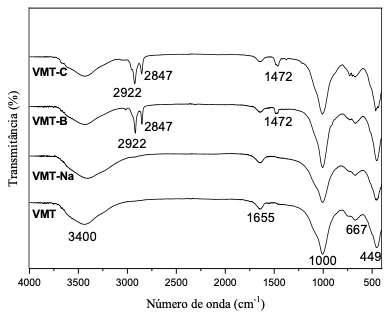 Os espectros da VMT in natura e da VMT–Na são idênticos. Nesses espectros, observam–se bandas características da VMT. Verifica–se um pico em 3.400 e outro em 1.655 cm–1 referente à frequência de vibração dos grupos OH e a presença de H2O, respectivamente, na argila. Na região de 1.000 e 449 cm–1 são encontradas as vibrações de grupos Si–O. O pico presente em 667 cm–1 corresponde às vibrações de grupos Al–O [3,4,15]
