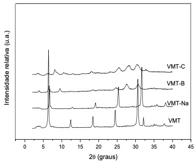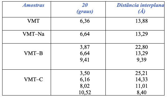 A Tabela 1 apresenta a posição do pico de difração característico (plano (001)) (2θ) da VMT in natura, VMT–Na, VMT–B, VMT–C e suas respectivas distâncias interplanares.