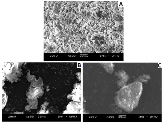 Microscopia eletrônica de varredura (MEV). A técnica de microscopia eletrônica de varredura foi utilizada para verificar as possíveis mudanças morfológicas na vermiculita com a adição dos sais de amônio quaternários. A Figura 4 apresenta as fotomicrografias para a VMT in natura (A), para a VMT–B e para a VMT–C.