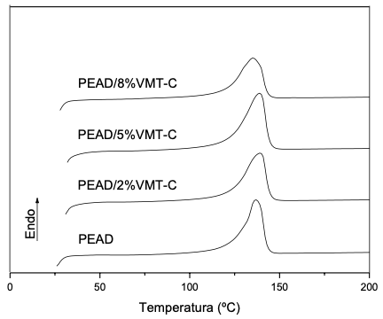 A análise das curvas permitiu observar que para todos os sistemas estudados não ocorreram mudanças significativas na temperatura de fusão cristalina (Tm) do polímero. Resultados semelhantes foram encontrados por Majeed et al. [21] no estudo de nanocompósito de polietileno de baixa densidade (PEBD) e 3% em peso de argila haloisita.