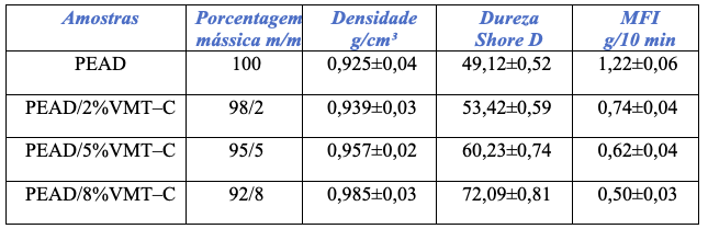 Caracterização físico–mecânica. Na Tabela 2 são apresentados os valores de densidade, dureza e índice de fluidez (MFI) do PEAD e dos compósitos de PEAD e VMT–C com diferentes teores de argila.