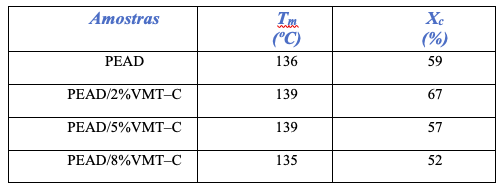 O PEAD puro obteve grau de cristalinidade menor do que o compósito PEAD/2%VMT–C, entretanto comparando apenas os compósitos de PEAD/VMT–C notou–se que o grau de cristalinidade do polímero diminui à medida que a concentração de carga foi aumentada. Esse resultado mostra que a formação dos cristais possivelmente foi afetada pelo teor de argila. De acordo com Fitaroni et al. [22] a presença de um segundo componente pode perturbar o mecanismo de cristalização do polímero. A adição de argila dificulta a ordenação dos cristais, impedindo, assim que ocorra a cristalização. Desta forma, quanto maior for o teor de VMT–C menor será a tendência do material cristalizar.