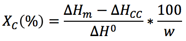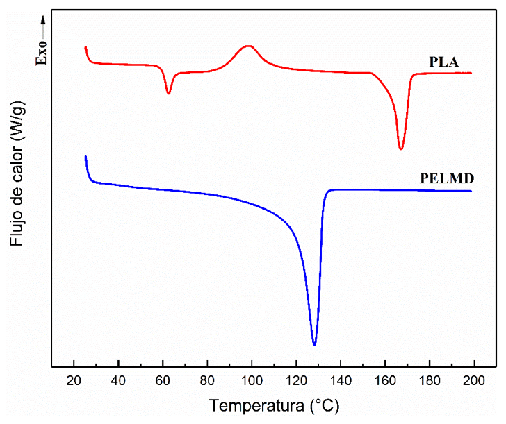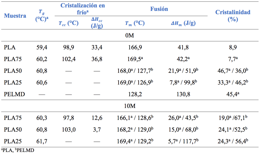donde ΔH0 (PLA) y ΔH0 (PELMD) son las entalpías de fusión por gramo del polímero 100 % cristalino (cristal perfecto) para el PLA (93,7 J/g [21]) y el PELMD (288 J/g [5]) respectivamente y es la fracción en peso del componente en cuestión en la mezcla.