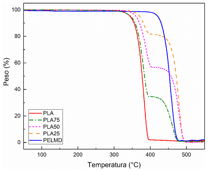 Los materiales puros exhiben un proceso de degradación térmica de un solo paso. Es posible observar que el PELMD posee una mayor estabilidad térmica comparado con el PLA. El PELMD exhibe una temperatura inicial de degradación alrededor de los 423 °C con una velocidad máxima a los 460 °C mientras que la temperatura inicial de degradación del PLA es de 344 °C y muestra una máxima degradación a los 381 °C.