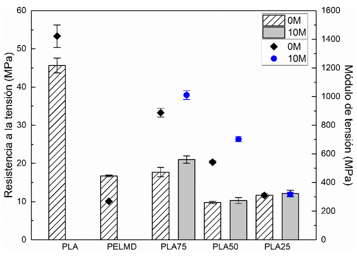 Es posible observar que la adición del MAPE tiene un efecto más significativo en el módulo de tensión para las composiciones PLA75 y PLA50. Por ejemplo, para la composición PLA75, se tuvo un incremento del 13,9 % (de 887,2 a 1010,5 MPa) mientras que para PLA50, el incremento fue de 29,7 % (de 542,3 a 703,4 MPa). Estos incrementos se pueden atribuir a que el MAPE promueve cierta adhesión interfacial, resultado de interacciones químicas entre los componentes (como se mostró en los resultados de FTIR), que mejora la transferencia de esfuerzos en la mezcla. Resultados similares fueron obtenidos por Yoo et al.[25] quienes utilizaron como AC anhídrido maleico injertado en PP (PP-g-MAH) en mezclas PP/PLA. Reportaron un incremento máximo en las propiedades de tensión a una concentración del 3 % de PP-g-MAH.