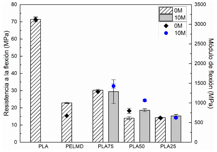 Las propiedades mecánicas de tensión y flexión de las mezclas sin compatibilizar resultaron ser menores en comparación con las propiedades de los polímeros puros, evidenciando la incompatibilidad entre el PLA y el PELMD. La adición de MAPE tuvo mejores resultados para las composiciones PLA75 y PLA50, en donde se obtuvieron incrementos en el módulo de tensión de 13,9 y 29,7%, y en el módulo de flexión de 11,3 y 33,2%, respectivamente.
