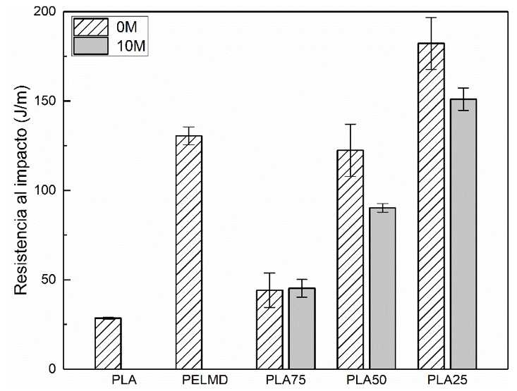 Finalmente, de manera general, se observó un efecto sinérgico en la resistencia al impacto de las mezclas (con y sin MAPE) teniendo un incremento de hasta el 40% para la muestra PLA25 sin MAPE en comparación al PELMD.