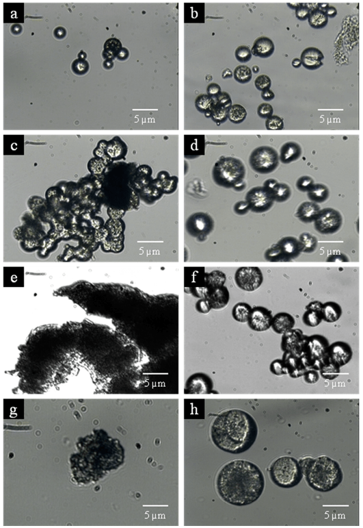 Estudio de la degradación de las microcápsulas sin contenido de CX. Ensayo in vitro en condiciones fisiológicas humanas. Se tomaron entre 3–5 mg de cada microcápsulas vacías y se añadieron a 1 mL de solución buffer de fosfato a pH = 7 dispuestos en tubos de ensayo, los cuales fueron sumergidos en un baño termostático a una temperatura constante de 37°C durante un período de tiempo que permitiera estudiar la degradación de las microcápsulas, hasta que perdieran su morfología esférica. Para estudiar estos cambios en la morfología de los dispositivos, se tomaron alícuotas cada cierto tiempo y se observaron en un microscopio óptico.