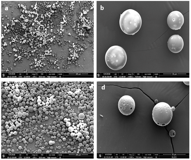 Se puede observar que a las primeras 7 horas de exposición en el medio, las microcápsulas aun conservaban su morfología, y algunas poseían pequeñas erosiones superficiales. A los 3 días de exposición (72 horas), la pérdida en la morfología de PDL fue evidente, mientras que PL aún mantuvo su morfología esférica. Posteriormente, al mes de exposición (30 días), se notó una disgregación de la masa amorfa en las microcápsulas de PDL, mientras que PL permaneció en su forma esférica con erosiones en su superficie.