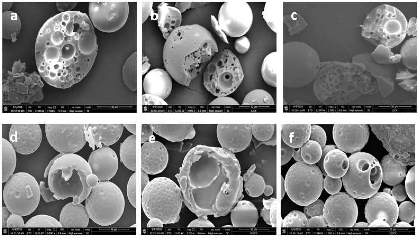 Caracterización por MEB de microcápsulas con contenido de CX generadas por el método de doble emulsión por evaporación de disolvente. La morfología externa de las microcápsulas de PL con CX, muestra una superficie suave con pequeños agujeros, son esféricas, y poseen una estructura interna tipo panal o reservorio, atribuida también a gotas de la solución de fármaco atrapadas dentro de las microcápsulas (Figura 2b). En el caso de PDL, son partículas esféricas, con superficie externa rugosa (Figura 2d). La estructura interna es un tanto diversa mostrando una morfología tipo cáscara (Figura 3d) y reservorio (específicamente en la Figura 3f donde se visualizan poros internos), con grandes agujeros a diferencia de la estructura interna de PL (Figuras 3a, 3b, y 3c). Esta diferencia en la estructura interna, se puede deber a una coalescencia de las gotas de la fase acuosa del fármaco de la primera emulsión en las microcápsulas de PDL, las cuales se concentraron en la matriz polimérica, en algunas microcápsulas, mientras que probablemente en la mayoría de ellas y en PL, la coalescencia de las gotas no fue completa y quedaron incrustadas en la matriz una vez que se evaporó el disolvente para formar las microesferas.