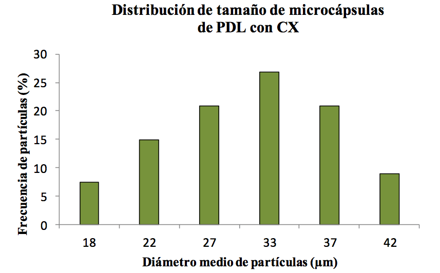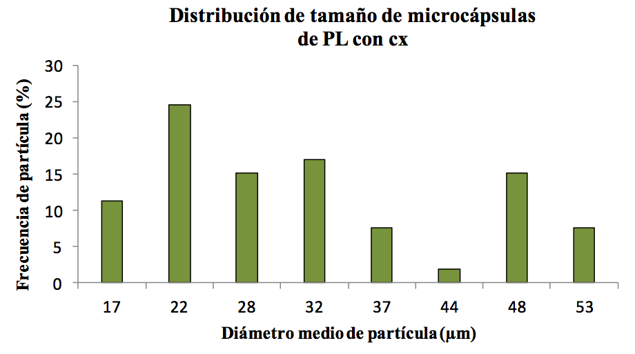 En la distribución de tamaño para las microcápsulas de PDL, se observa que la mayoría de las microcápsulas (69%) tienen diámetros medio que van de 27 ± 1 µm a 37 ± 1 µm, estadísticamente. El otro 31% se distribuye en diámetros medio de 22 ± 1 µm (15%), 42 ± 2 µm (9%) y 18 ± 2 µm (7%). En el caso de las microcápsulas de PL, un 25% de las microcápsulas posee un diámetro medio de 22 ± 1 µm, y el otro 75% se distribuye en tamaños entre 32 ± 2 µm (17%), 48 ± 1 µm (15%), 28 ± 2 (15%), 17 ± 4 (11%), 37 ± 1 µm (7,5%), 53 ± 1 µm (7,5%) y 44 (2%).