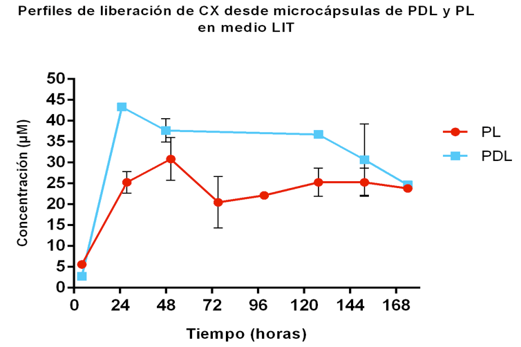 Perfil de liberación de CX por degradación de las microcápsulas. Ensayo in vitro en medio LIT. Para ambos perfiles, se observó una liberación de fármaco bifásica (Figura 6), lo cual implica una primera fase con un aumento de concentración de medicamento en el primer día para PDL, y PL. Este proceso se conoce como efecto de estallido inicial (burst, en idioma inglés) el cual se atribuye a la cantidad de fármaco que queda adherido a la superficie externa de la microcápsula y al que se encuentra internamente más cerca de la superficie, que es expulsado con mayor rapidez al entrar en contacto con un medio acuoso; una vez que se generan las primeras erosiones, comienza una estabilización en las curvas, segunda fase, donde la concentración de fármaco se libera de manera más controlada desde la matriz; en esta fase ya la expulsión del medicamento es por difusión a través de las porosidades de la microcápsula.