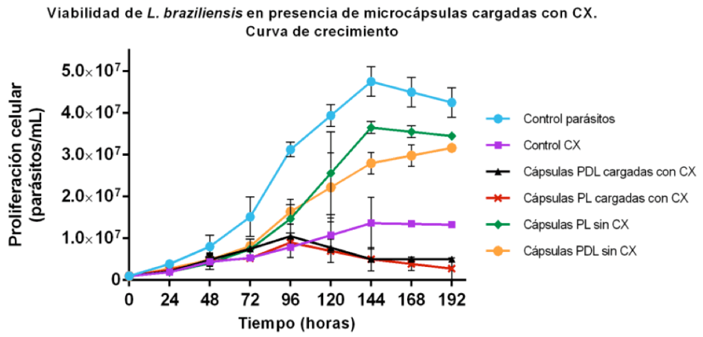 Determinación de la viabilidad de promastigotes de Leishmania braziliensis en presencia de microcápsulas cargadas con CX mediante conteos directos. Curva de crecimiento. De acuerdo al perfil de liberación en medio LIT mostrado por las microcápsulas, se procedió a evaluar el efecto parasiticida del CX dispensado por las mismas sobre promastigotes de L. braziliensis. A continuación en la Figura 7 se muestra el resultado de los conteos realizados para este ensayo: