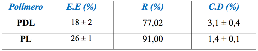 La eficiencia de encapsulación del fármaco (E.E) se expresó como una relación entre la masa de fármaco encapsulada y la masa de fármaco inicial, y además se expresó también como rendimiento de producción de cápsulas (R, masa neta de microcápsulas entre la masa total de polímero + droga usada en formulación), y contenido de droga en las microcápsulas (C.D, masa de fármaco encapsulada entre masa de microcápsulas) [5,6].