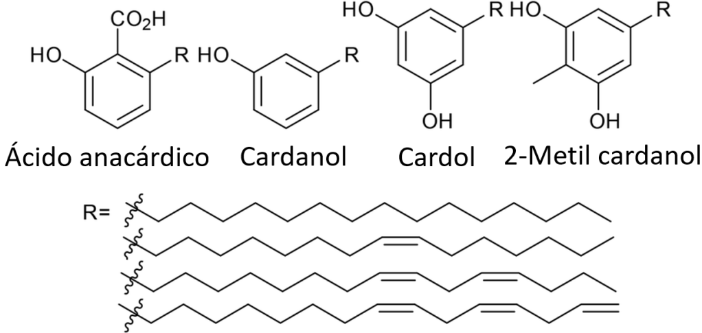 El cardanol es un recurso renovable, no comestible y no tóxico, el cual se encuentra en el líquido de la cáscara de la semilla de los frutos de anacardo (CNSL) del árbol anacardo (Anacardium occidentale L) (Briou, Caillol, Robin, & Lapinte, 2019; Kobayashi, 2017; Vaithilingam y Muthukaruppan, 2017).