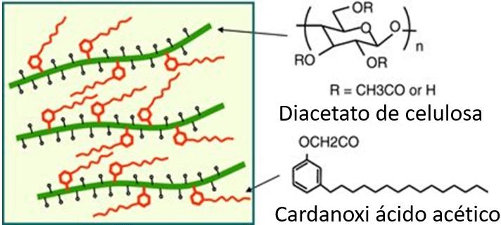 Aditivo para diacetato de celulosa. Se investigaron las características hidrofóbicas, mecánicas y térmicas de un diacetato de celulosa termoplástico (CDA) unido con cardanol modificado (Iji, Moon, y Tanaka, 2011). El cardanol fue sometido a un proceso de hidrogenación, esto para evitar la reticulación entre las moléculas de cardanol durante el enlace con el CDA, además, el grupo hidróxido del fenol en el cardanol se sustituyó por cloruro de ácido acético para lograr la esterificación con los grupos hidróxido en el CDA (Iji et al., 2011).