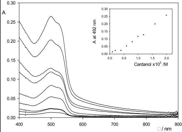 Como resultado en el trabajo, luego de realizar mediciones de espectrofotometría (Figura 3), se expone un aumento en la absorbancia al aumentar la cantidad de cardanol hidrogenado en la disolución. Además, se obtiene una disminución de la CMC al utilizar el cardanol hidrogenado como aditivo al Orange OT, lo que permite su disolución a concentraciones menores de surfactante, esto conlleva a ventajas económicas y técnicas (Fontana et al., 2015).