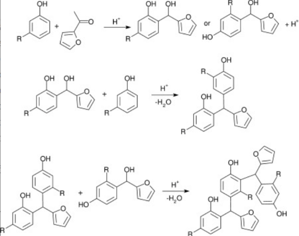 Absorbente de petróleo. En esta área (Varela, Oliveira, Souza, Rodrigues y Costa, 2013) prepararon compuestos de cardanol–furfuraldehido maghemita (γ–Fe2O3), mediante una polimerización en masa con el objetivo de producir resinas magnéticas amigables con el ambiente capaces de absorber el petróleo derramado en el agua. El cardanol y las resinas de furfural se prepararon mediante catálisis ácida, el mecanismo químico propuesto se muestra en la Figura 5, siguiendo una planificación factorial (DoE) (Varela et al., 2013). Los materiales obtenidos presentaron una buena fuerza magnética aliada, con una capacidad considerable de eliminación de aceite por cada gramo de resina utilizada pudo eliminar 10 g de petróleo del agua, en comparación con otros trabajos realizado por este mismo grupo como los compuestos magnéticos a base de poliuretanos y resinas alquídicas fueron capaces de eliminar 4,1 ± 0,1 g/g y 8,3 ± 0,9 g/g de petróleo, respectivamente (Varela et al., 2013).