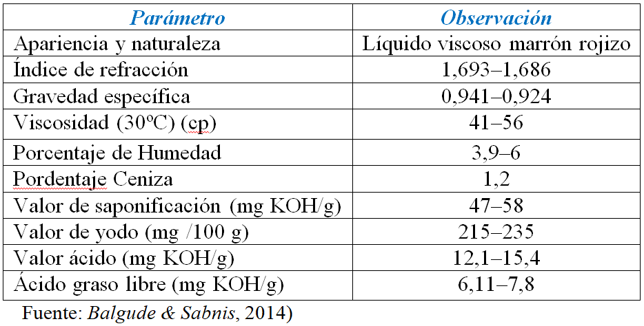Este árbol es originario de Brasil y de las costas de Asia y África; sin embargo, ahora se ha implementado su cultivo en la India, Vietnam, Mozambique, la República de Madagascar, Filipinas y otros países tropicales (Wilson, 1975 citado en Dinesh y Anagha (2014), Araújo, Saffi, y Richter, (2011) citado en Dinesh y Anagha (2014). El CNSL, es un subproducto obtenido del procesamiento industrial del anacardo, alrededor del 30–35% del peso de la cubierta es CNSL, es un aceite viscoso oscuro, con un olor característico, muy rico en lípidos fenólicos. La composición química de este líquido se basa principalmente en cardanol, cardol, ácido anacárdico y en una especie metilada de cardol (Fontana et al., 2015; Gomez, Arnaiz, Cacioppo, Arcudi, y Prato, 2018; Huo et al., 2018; Lomonaco, Mele, y Mazzetto, 2017; Souza et al., 2011; Vaithilingam et al., 2017).