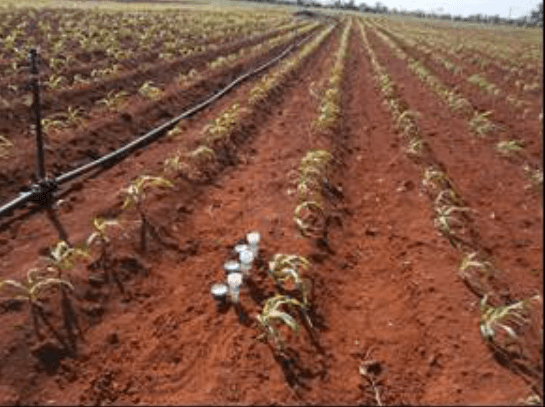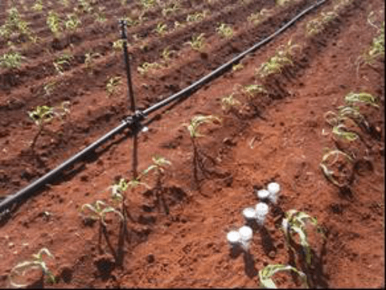 El agua utilizada para el riego es de origen subterráneo cársica, característica de la zona Sur de Artemisa. Según la Norma Cubana NC 1048 (2014), con valor de CE 0,83 dS·m–1, a una temperatura de 25°C, se clasifica como categoría I, para un suelo Ferralítico Rojo compactado no presentan restricciones ni limitaciones de uso.