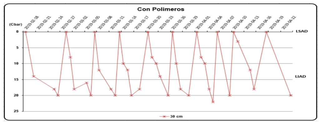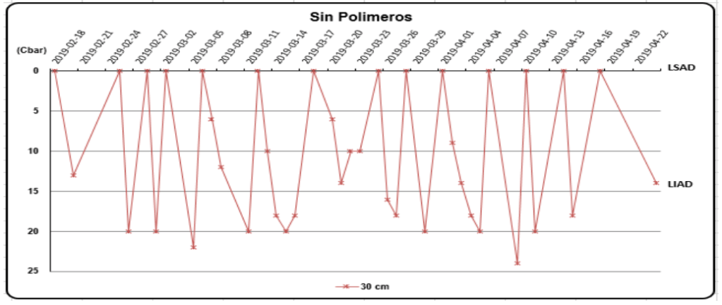 El agua es esencial para el crecimiento, la actividad metabólica y la supervivencia de las plantas. Muchos organismos, entre ellos los vegetales, dependen para sobrevivir del agua disponible más que de cualquier otro factor ambiental, y su déficit incide negativamente en los bajos rendimientos de los cultivos (Taiz y Zeiger, 2006). En la Figura 7, tratamiento sin polímeros ocurre algo similar, el contenido de agua en el suelo se mantuvo entre el LSAD y el LIAD. En valores de tensión también a la profundidad de 0,30m la humedad en el suelo estuvo en tensiones entre 0 y 20 kPa o Cbar. Para dicho tratamiento se ejecutaron 13 riegos con norma parcial neta de 246,0 m3·ha–1 y norma total de 3.198,0 m3·ha–1, el intervalo de riego promedio fue de 4 días.