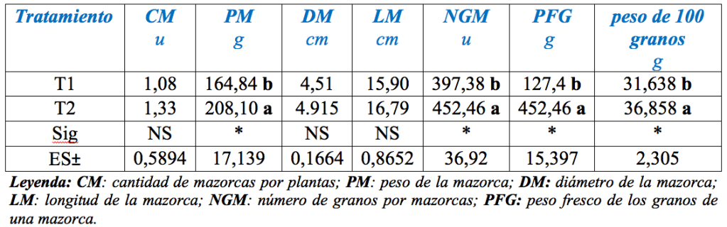 - En cuanto a los componentes del rendimiento se encontraron diferencias significativas en el peso de la mazorca, número de granos por mazorcas, peso fresco de los granos y peso de 100 granos a favor del tratamiento 2, lo que condujo a un incremento del rendimiento en 14%.