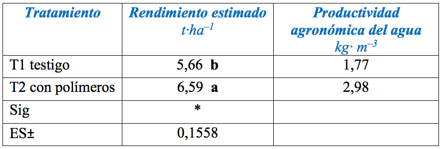 Con los valores mostrados en la Tabla 3 se puede apreciar que con la aplicación de polímeros súper absorbentes se logra un rendimiento estimado de 6,59 t·ha–1, superior en 0,93 t·ha–1 al testigo, mostrando su posible aplicabilidad en las condiciones de la agricultura cubana.