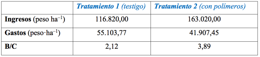 Análisis económico para definir la pertinencia de la aplicación del polímero a través de la relación beneficio – costo (B/C). Al analizar la pertinencia de la utilización del polímero para las condiciones de estudio se muestra en la Tabla 4, que con la aplicación del hidrogel se logra una mejor relación beneficio–costo con respecto al tratamiento sin hidrogel lo que confirma desde el punto de vista económico la viabilidad de su utilización.