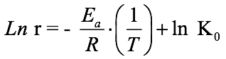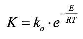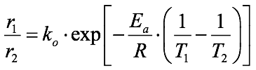 donde K, es la constante de envejecimiento, kel factor pre–exponencial, r1 reacción a la temperatura T1, r2 reacción a la temperatura T2, Ea energía de activación (J/mol·K o cal/mol·K), y R la constante de los gas (8,314 J/mol·K o 1,987 cal/mol·K)