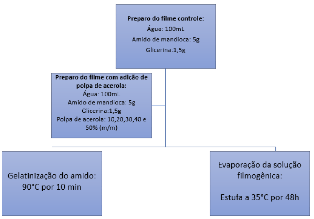 A partir deste procedimento, novos filmes foram sintetizados com a adição de polpa de acerola com concentrações de 10, 20, 30, 40, e 50% em relação a massa do amido (F10, F20, F30, F40 e F50), de acordo com a proposta de Dantas et al. [11], com algumas modificações nas concentrações de acerola utilizada. A Figura 1 ilustra as etapas para a obtenção dos biofilmes.