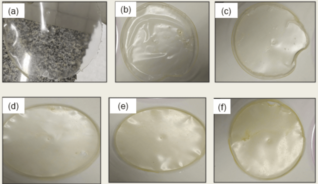 Preparos dos biofilmes. Para efeito de controle, primeiramente foi elaborado um biofilme sem adição de polpa de acerola (FC). Os reagentes utilizados na síntese foram: amido de mandioca, glicerina e água destilada. As proporções utilizadas estão descritas na Tabela 1. Para a formação do biofilme seguiu–se como proposta a metodologia de Fakaouri et al. [15]. Para tal, o amido e o glicerol foram previamente pesados em balança analítica, colocados em um copo Becker juntamente com a água destilada. O copo foi levado para aquecimento em chapa aquecedora com agitação constante e aquecido até uma temperatura de 90°C por 10 min, para garantir a total gelatinização do amido. Após, a solução filmogênica formada, foi disposta em placas de poliestireno e colocada em estufa na temperatura de 35°C para que ocorresse a secagem por evaporação, técnica denominada casting.