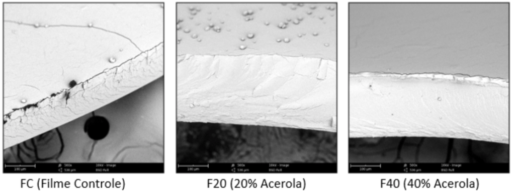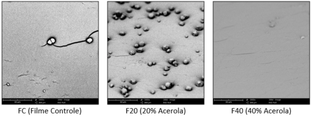 Através das fotomicrografias de superfície com aumento de 1.000 X (Figura 3), e das fotomicrografias da seção transversal com aumento de 500 X (Figura 4), é possível observar que o biofilme FC (sem adição de acerola) apresentou uma estrutura homogênea, porém, observam–se alguns grânulos de amido não dissolvidos. Além disso, nota–se também, algumas rachaduras em sua superfície. O filme F20, expôs bastante irregularidades e descontinuidade, com muitos grânulos de amido não dissolvidos na superfície, provavelmente ocorreu algum erro experimental referente a temperatura de gelatinização que impediu o rompimento dos grânulos de amido. Já o filme F40, apresentou uma estrutura compacta e densa, praticamente sem irregularidades.