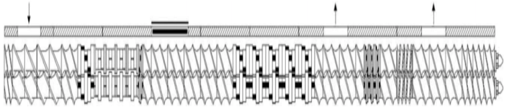 Processamento por Extrusão. O PET foi seco a 110°C/24 horas em estufa antes do processamento. As blendas de PET/copolímeros foram preparadas em extrusora dupla rosca modular corrotacional Coperion Werner & Pfleiderer ZSK 18 mm (L/D = 40) com uma velocidade de 250 rpm e taxa de alimentação de 3 kg/hora. O perfil térmico de aquecimento da extrusora até o cabeçote foi mantido em 280°C em todas as zonas. A configuração da rosca utilizada foi composta com elementos de transporte, distributivos e dispersivos, conforme mostrado na Fig. 1. Para as blendas extrusadas foram utilizadas as mesmas composições da Tabela 2.