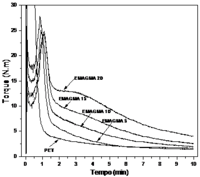 Análise Reológica por Reometria de Torque. A Figura 2 ilustra as curvas de torque em função do tempo do PET e das blendas PET/EMAGMA. O PET, após o carregamento no estado sólido dentro da câmara de mistura, apresenta um pico máximo de torque em torno de 110 N·m (não mostrado no gráfico) e, depois de sua fusão, ocorre uma redução acentuada do torque até o tempo de 1 minuto e mais lentamente até o tempo final do processo em 10 minutos.