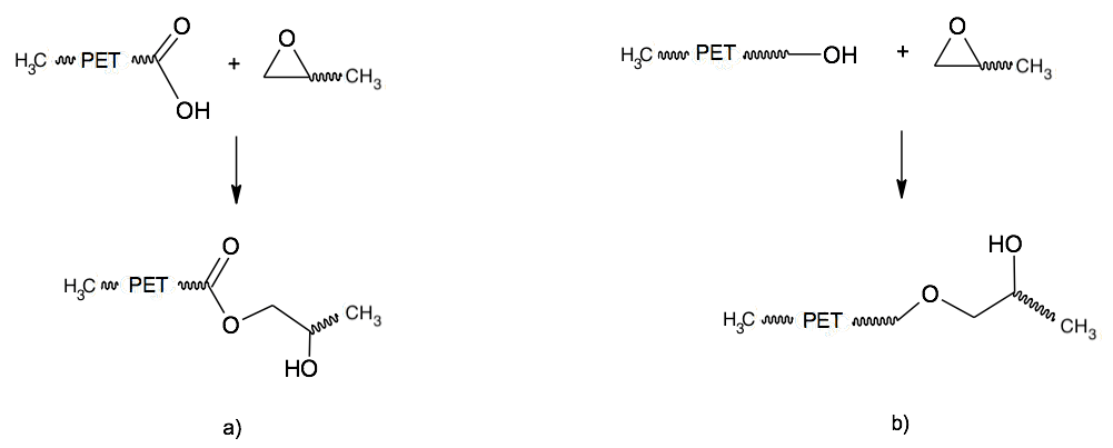 Xanthos et al. [11] estudaram a reatividade do {N, N’–bis [3 (carbo–2′, 3–epoxi propoxi) fenil] piremelitimida} diepóxido e do copolímero EGMA com os grupos terminais carboxila e hidroxila de PET. Os autores concluíram que o diepóxido e o EGMA reagiram com PET, atuando como um extensor de cadeia. Eles também observaram que o diepóxido mostrou maior reatividade que o EGMA e poderia ser usado em concentrações mais baixas.