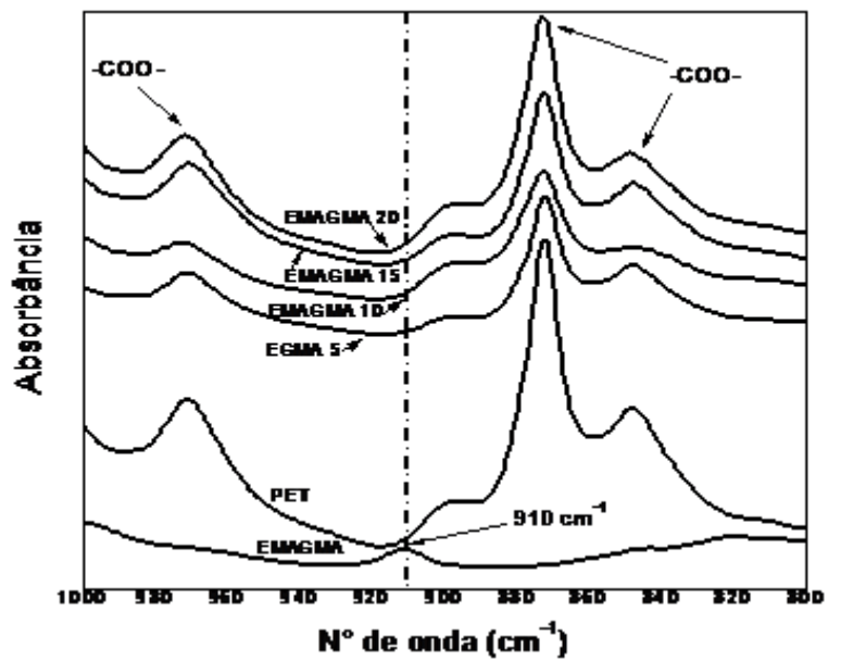 Espectroscopia na Região do infravermelho por Transformada de Fourier (FTIR). Os espectros de FTIR do PET, EMAGMA e das blendas PET/EMAGMA são ilustrados na Figura 5. Observa–se a existência de bandas típicas presentes na cadeia do PET, situadas em 1.000 e 800 cm–1, que representam a vibração de deformação do grupo éster (– COO –) [19]. No espectro do EMAGMA, verifica–se a presença do anel epóxi presente nos grupos metacrilato de glicidila (GMA) caracterizada pela existência de uma banda localizada entre 908 – 912 cm–1, correspondente à contração das ligações C–C, e estiramento das ligações C – O [20–23]. A banda do anel epóxi pode ser visualizada para o EMAGMA, indicada por uma seta no espectro dos copolímeros a 910 cm–1. É possível observar o desaparecimento desta banda para as blendas, o que sugere a ocorrência de reação entre anel epóxi presente nos copolímeros em todas as composições e os grupos terminais carboxilas e/ou hidroxilas do PET (ver Figuras 2 e 3). Por tanto, os resultados de FTIR corroboram as mudanças observadas nas análises reológicas.