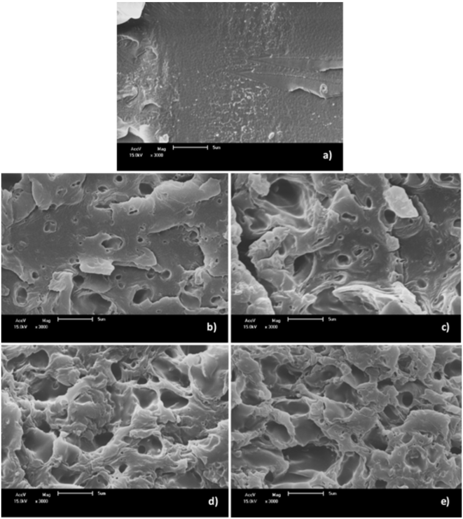 Figura 5. Fotomicrografias do a) PET; b) EMAGMA 5; c) EMAGMA 10; d) EMAGMA 15; e) EMAGMA 20. Aumento de 3.000 X e escala de 5 µm.Microscopia eletrônica de varredura (MEV). A Figura 5 apresenta as micrografias do PET (Figura 5a) e das blendas PET/EMAGMA (Figuras 5b, c, d e e). Vale salientar que foi realizada a extração de fase dos copolímeros antes das análises por MEV, como descrito no item 2.2.5. A partir da extração de fase do copolímero observamos que não há um aumento acentuado no tamanho médio dos domínios da fase dispersa, como em outros trabalhos [23–25], com o aumento da concentração de copolímero EMAGMA, embora o número de domínios de fase dispersa aumente. Resultado semelhante foi relatado por Chapleau y Huneault [10] que investigaram o efeito de modificadores não reativos e reativos nas propriedades de impacto do Poli(Tereftalato de Etileno) (PET). Os autores observaram que o tamanho dos domínios da fase dispersa permaneceu quase constante com o aumento da concentração do modificador reativo (contendo grupo GMA). Eles atribuíram esse resultado às reações químicas entre os grupos funcionais de PET e os grupos funcionais presentes no modificador formando um copolímero na interface e suprimindo a coalescência entre as partículas modificadoras. Observamos também que esse efeito dispersivo influenciou drasticamente a resistência ao impacto (RI) das blendas. Provavelmente à flexibilidade dos blocos de EMA, presentes no copolímero EMAGMA, pode também ter contribuído nesse aumento considerável. Este fato é mais pronunciado para a blenda EMAGMA 20 que apresentou RI quase oito (8) vezes superior ao do PET puro, indicando um processo de super tenacificação.
